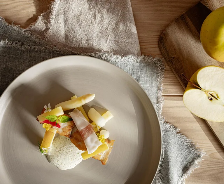Ingredientes para 4 personasRodaballo salteado con manzana Golden Delicious, espárragos blancos, sabayón de vino blanco y tocinoDescubre más - 40